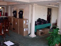 Well everyone, sorry we didn't report in yesterday, there was a little thing called sleep we had to catch up on before presenting this opening story from IKF Homebase here at the Radisson Hotel in Davenport Iowa for this weekends 2002 IKF USA National Amateur Kickboxing Championships. The trip took a bit longer than I wanted it to but after driving over 1,800 miles, here we are at the Radisson Hotel for this weekends 2002 USA Nationals. All that's missing is YOU, the fighters and your trainers, coaches, our event officials and fight fans. Bring It ON! The trip took about 30 hours which included 5 or 6 stops for gas, a few stops for snacks and event supplies I needed to pick up along the way and a stop in Omaha Nebraska to have lunch with our good friend Brooks Mason. I try to live by that saying "Don't ask of others what your not willing to do for yourself," which as some of you know, gets me in trouble sometimes when I don't delegate enough responsibilities to others willing to do so (Last years Nationals for example...) so as promised, I drove the marathon trip here once again knowing that maybe someday, someone else will be willing to do it instead so I can sit comfortably on a plane like the rest of our IKF Staff. While the others are due to arrive Thursday and Friday, Johnny Davis arrived late last night by plane. Johnny of course was refreshed and ready to roll while I needed a little rest after unloading and carrying the 20 plus boxes to our IKF Radisson Office (Right & Below) filled with Championship Belts, IKF Souvenirs, T-Shirts, Gloves, Shin Pads, Computer Equipment and other event supplies. About 10 trips to the room later, our IKF Radisson Office quickly filled up.