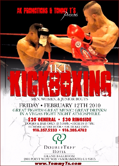 AK Promotions of Rocklin, California and partner- Tommy T's Comedy and Dinner Theatre of Rancho Cordova, California have plans to light a fire to ignite a new wave of kickboxing entertainment in the Sac. Area. This is the third show in the past six months and both prior shows have been overall very successful with action - packed bouts, a sellout show on the first one and a respectable crowd at the second show in a larger venue. Fans left wanting more and now they will get their chance to taste it once again...but this time with a bit more flare! The Doubletree Hotel of Sacramento, California is once again opening its doors to AK Promotions Friday, February 12th at 7:PM. They were impressed enough with the last show back on November 22nd '09 to give the promotion company its beautiful Grand Ballroom this time around which is adorned with enough chandelier to impress a prince! | ||