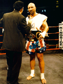 This event was the turning point as to how the IKF gets involved with Pro Purses. Before this event, the IKF had always trusted Promoters and Athletic Commissions when they assured them that the Purse money was honestly going to be paid. And why question these promoters who had already paid Don Wilson in full his $150,000.00 purse and Dick Kimber a $10,000 training fee in January. They had also already paid all the PPV deposits, the IKF helped greatly with the sanctioning fee expenses charging for 5 World Titles, 1 US Title and 6 Title Belts only $2,855.00. The Promoters had also already paid nearly $20,000 in plane tickets for fighters, officials and special guests as well. Although the Massachusetts State Athletic Commission assured the IKF that all the purse money was covered in the promoters license, it was a shock to EVERYONE after the event when none of the Fighters Checks could be cashed and ALL of the checks the promoter wrote to each of them all later BOUNCED! Rick Roufus (Left Below) was on top of the World After Defeating Stan Longinidis and winning his IKF World Title on Live PPV TV at Mass Destruction. However, it was the emotional trauma of not being paid his Purse that would quickly take him out of his winning ZONE! Although Roufus was paid $10,000 in training expenses up front, the Promoter never paid Roufus his actual purse of $91,000. YES, "$91,000!" After the event, promoters were no where to be found, leaving IKF President Steve Fossum alone in the arena with all the fighters and trainers trying to deal with things. The box office which Fossum was told by the promoters would cash everyone's check was closed and the Massachusetts State Athletic Commission had left the building. After an extensive search of the arena, Fossum found co-promoter Scott Haddad. Haddad who was discussing the un-paid purses with Roufus' manager and trainer in a private conference room. While the meeting took place, Dick Kimber (Pictured Below Left) came in and Haddad paid him $10,000 in cash right in front of Fossum, Roufus' manager and trainer. (Kimber had already received $20,000 for training fees around January of 1999 and demanded to be paid another $20,000 in cashiers checks only 3 hours before the event or he wouldn't fight. We were told later that the cashiers checks were for the other fighters. There were many issues that revolved around Kimber's pay as a possible partner of the promotion and when and how he was to be paid but these are all speculated or unconfirmed and now very hard to believe after we have seen the actions taken by the promoters to pay all the other fighters. ESPECIALLY hard to believe since Haddad never brought these issues up when he paid Kimber $10,000 in cash AFTER the event. ) Haddad apologized that he didn't have all the fighters "CASH" on hand but assured everyone their checks would clear that week. Of course... They never did. To make Haddad's credibility worse, he "FAKED" a phone conversation with co-promoter Phil Malonson acting as if Malonson was assuring him he could meet Roufus and Longinidis in the morning with their full purse. However, it was all a bunch of lies as no one ever met Roufus or his trainers or Longinidis the next day. The week after the event, only 2 checks cleared the bank. Curtis Bush's $2,500 purse and Juan Adams check for $1,000. Adams was a fighter who didn't even fight. Some time later, Kevin Rosier was paid half his $5,000 purse. In the end, who didn't get paid? Here's the list;