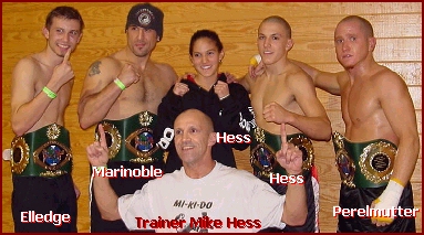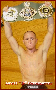 WELTERWEIGHT CHAMPION BOUT 3 As far as Halmstad, at the 2002 IKF USA National Championships he was registered in the light middleweight division where he first defeated Lucus Larson of Mondovi, Wisconsin USA, by unanimous decision 30-27 on all 3 cards but lost to eventual champion Anthony McGaughey by unanimous decision 30-27 on all 3 judges cards. For this event he moved down to a more natural weight for him which was a smart move as far as being crisp on his kicks and punches but at the lower weight, lacked the punching power he had when heavier. Halmstad set the pace early winning the first 2 rounds on 2 of the 3 judges cards but in rounds 3 and 4 he seemed to play into Perelmutter's inside fight game instead of using his reach which cost him dearly as Perelmutter took rounds 3 and 4 on all 3 judges cards. This one came down to who had what in the final round and in the end Perelmutter took the round on all 3 judges cards and with it, took home the belt with a unanimous decision win, 48-47, 48-47 and 49-45. - PHOTO. |