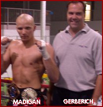 At age 14 Ryan Madigan of Cuyahoga Falls Ohio, USA started karate lessons. At 17 he entered the ring for the first time to compete in his first kickboxing bout. After an impressive amateur career of 18 wins and only 2 loses with 7 wins coming by TKO/KO, Madigan made the move to Pro status. Like many Pro Kickboxers, once there he found the fight offers few, but what opportunities that have come his way, he's made the best of them winning all 3 of his bouts without a loss. Since his phone wasn't ringing off the hook for fight offers, Madigan felt like many pro kickboxers, "If you really want something, sometimes you have to go get it yourself." What he wanted was an IKF Pro Title! So together with his partner Mark Gerberich (With Madigan below right) of Paramount Sports Marketing and his wife Allison (Both at right after Ryan's victory Saturday night) and the Madigan's company, Lion Enterprises, they hosted their first event, FISTS and FEET of FURY. The event was held at the Pinnacle Sports Complex in Akron, Ohio. The complex is a dynamic 70,000 plus square feet indoor soccer stadium. As many first time promotions go the crowd wasn't to capacity but it was full enough to offer plenty of roar for all the bouts. After a full undercard of 9 bouts (See below for reviews and results) of which 2 were exhibitions, it was time for the number 3 Ranked Ryan "The Lion" Madigan show! Madigan's good friend Dan Rawlings had just dismantled well known full contact rules fighter Keith Nesbitt in a single round (See details below) and Madigan was looking to do the same to his opponent, Kevin Hobbs of Phelps, New York. The bout was for the vacant IKF Pro MTR Super Middleweight East Coast Title. Hobbs entered the ring uneventfully (Below Left) with a pro record of 2-1 and an amateur record of 7-3. However when it was time for "The Lion" to enter the ring, he took full advantage of the moment as every fighter in a title match should. The crowd came to their feet as the music started and Madigan took his time as he walked, posed and danced his way with confidence for the hometown crowd to the ring. This kind of showmanship is what we need more in this sport. Once in the ring, the Lion dropped his elaborate fight robe (Another thing all fighters should have.) to unveil a chiselled fighting machine. Once the ring talk by referee Dan Stell was given the bell rang and the action started. Madigan started strong landing several strong kicks to Hobbs' neck. One dropped him (right) and when Hobbs didn't get up quickly (In MuayThai Rules, if a fighter stands quickly after a flash knockdown he isn't given a standing 8 count) referee Dan Stell started his 8 count. Once recovered The Lion went back to work landing several strong combinations as Hobbs failed to answer back with anything of any threat to Madigan. When round 1 came to an end, Referee Dan Stell checked on Hobbs in the corner. After asking him several times, Hobbs came up with the same answer, "No, I can't continue!" As Stell waived his arms to call the bout the hometown crowd went wild as Ryan "The Lion" Madigan became the new IKF Pro MTR Super Middleweight East Coast Champion with a win by TKO! The win puts Madigan in position to strive for yet another level in the MuayThai Super Middleweight division such as a shot at the vacant IKF USA or North American Title. Here's the results of all the nights action below. |