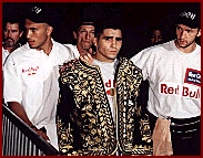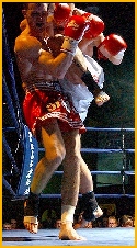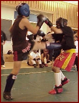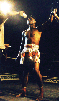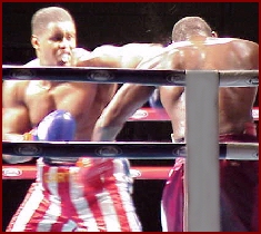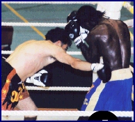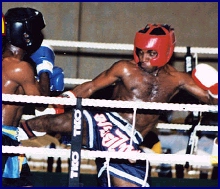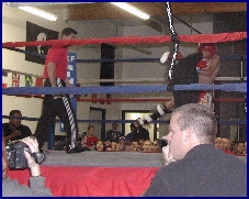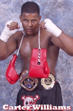 November 30th, 2002 Monterey, Calif. Riot at the Hyatt: This last year former IKF USA National Amateur MuayThai Super Heavyweight Champion, (2001) Carter Williams (Pictured in red, white and blue trunks) moved to the pro ranks of Kickboxing. Since there, he's only had 1 loss. A questionable 2 knockdown decision rule at a K-1 qualifier in Milwaukee, Wisconsin. Williams, like many kickboxers found it hard getting fights so he and his trainer Gene Fields of Modesto, CA decided to start doing some Pro Boxing as well, and with it, he's found more success. This last weekend, Williams won his second PRO boxing fight. He dominated opponent James Monroe (Being punched by Williams in both pictures) of Los Angeles over 4 rounds to earn a unanimous decision at the Hyatt Regency Hotel in Monterey, CA, USA. A sell out crowd of over 1,500 people saw the 22 year old fighter earn his second professional victory. Many know that Williams is a very accomplished kickboxer but have commented, making the transition to boxing would be difficult. With Monroe possessing much more amateur and professional boxing experience, this was a big test for Williams who proved once again, don't underestimate him for a minute! Williams stated "If it wasn't for my