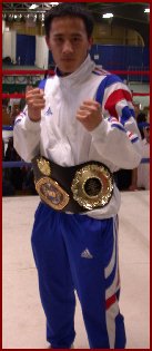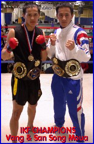 As the IKF ends 2002, San Shou once again takes the spotlight like it did in 2001. Last year it was Cung Le's win of an IKF World Title in mid December over Shoni Carter. This year the IKF calendar extended to today, December 28th, 2002. The first of today's events was at high noon in Fresno, California, USA. The other in Denver Colorado, USA later in the night. More on Denver later but for now, it's time to report on our last IKF Champions of 2002. The event was held during the Hmong New Year celebration at the Fresno, Fairgrounds in Fresno, California, USA. IKF Promoter Lou Moua (Above Left) was hoping to have 2 IKF Amateur San Shou Intercontinental Titles on his event today but after searching the globe, no one wanted to "Walk the Walk" with San Song Moua (Right in White) of France so with no challengers he walked away the winner without throwing a punch. However his brother wasn't as lucky. Vang Moua (47-0-1, 141, 5'11", 23) of Paris France "DID" have an opponent. Robert King (16-3-1, 140, 5-11") of Houston Texas, USA had no plans of letting Vang walk away with a free title. These guys fought a 5 round war that was a lot closer than the final announced scores. As some may know, San Shou scoring is done a lot like amateur boxing with ringside clickers. Each of the 3 judges click them as points are scored by each fighter. Punches and kick scores vary as to where they land on the body. Adding to this, each type of throw scores various points as well (1-3). At the end of the round, the fighter with the most points is awarded "1" point and the other, no points. However in this bout, throws would not be a factor. There were less than 5 successful throws in the entire bout. In fact, it wasn't until round 3 until one of them scored on a throw, a 3 point throw by Vang which King later matched. Neither fighter dominated the other in regards to actual pain. Both took their shots as they came and shook them off. In this bout, it would be the one who was more active with their hands and feet that would score the most and eventually take the title. To give you an idea as to how close this bout was, one of the judges had rounds 1 and 5 an even draw (9-9 and 16-16) while some of the other scores had the two warriors separated by as little as 1 or 2 points in some rounds. The best round was turned in by Vang. It was round 3 where he outscored King, 16-10, 15-12 and 16-7. There were no knockdowns or standing 8 counts given, just toe to toe fighting. In the end, Vang Moua (Above Left) was the more active fighter, winning all the rounds and taking home the last IKF Title of 2002, The IKF Amateur San Shou Light Welterweight Intercontinental Title by a score of 5-2, 5-0 and 5-0 in the 5 round battle. Here's the way the other bouts finished up on the day;