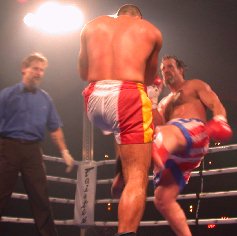 In Bracket B, match 1, Dan "The Lizard" Lucas (Left) will not be making his debut as a Pro fighter but he will be making his debut as a Leg Kicker. Lucas has already proved himself as a Champion in Full Contact Rules (Having won the USKBA Full Contact World Title) but this will be a new game to the Big Man. At age 30 and standing 6' tall, Lucas plans to weigh-in at about 215 lbs. His overall record is 22 wins with 2 loses and 1 draw. He trains at Mountain Storm Kickboxing in Rochester, New York, USA. Coming from a Kyokushinkai Karate background, Lucas shouldn't have much trouble adapting to leg kicks though, provided he's trained in the TRUE Kyokushinkai Karate style, which we believe he has. One things for sure though, Lucas better be prepared for the knees and the leg kicks because it's clear his opponent will be. At 21, Carter "The Black Cobra" Williams of Modesto California USA learned a valuable lesson in that August bout with Walker. If your entering the ring, "BE PREPARED ON ALL FRONTS!" This includes more than being able to punch hard. Williams found out punching hard doesn't win all the time... When it's a slugfest where talent meets talent, Conditioning wins out! After Carter lost to Walker (See above Walker info) on the undercard of the August K-1 he got back in the gym and it appears he's never left. Williams came back in a big way at this past years 2001 IKF USA National Amateur Championships. In his opening round he defeated heavily favored, "BIG" John Grantham (259 lbs) of Athens, Georgia, USA by split decision 29-28, 29-28 & 28-29 to advance to the final. The final wasn't any easier where he faced off against the 2000 IKF National Champion, Kurt Hasley. Carter defeated Hasley by unanimous decision, 29-27, 29-27 & 28-27 to win the IKF National Super Heavyweight Title.Williams stands 5'11 inches tall and plans to weigh in as a REALLY BIG MAN! Probably the biggest of them all Saturday night at about 255 lbs. He comes to the ring with a record of 12 wins, 5 loses, 1 draw and 9 of his wins coming by KO/TKO. He trains at the Academy Of Kickboxing under Gene Fields. |