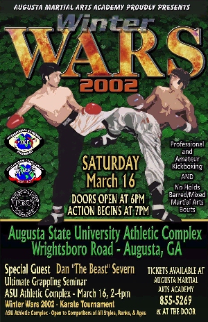 United States Title bouts in mixed martial arts and in kickboxing will be on the line in Augusta, Georgia on March 16, 2002, as Augusta Martial Arts Academy presents Winter Wars 2002. Southern sensation Cam McHargue will lock horns with veteran Todd "Crazy T" Carney for the vacated International Sport Combat Federation (ISCF) United States Light Middleweight title. In the co-main event, Heavyweights "Lightning" Lane Collyer (Left) and Kevin "Hurricane" Hudson (Below Left) will square off for the vacant IKF Pro United States Heavyweight Title in the full contact (kicks above the waist only) rules division. In the ISCF Bout, McHargue is known for pulling from his gymnastics background and exciting yet effective use of "flashy," athletic, and "high-risk" maneuvers in the ring. Carney has a reputation for always being willing to take bouts against anyone, at the "drop of a hat." This time, however, Carney has had ample time to prepare for a known opponent. The number 8 IKF Ranked Full Contact Rules Heavyweight Hudson, a former world kickboxing champion, is known for being able to "kick like a lightweight," and is making a long awaited return to the ring. His opponent, Collyer, is ranked #2 in the IKF Full Contact Heavyweight Rankings, #3 in the IKF International Rules Heavyweight Rankings and number 2 in the IKF MuayThai Heavyweight Rankings. Collyer has as aggressive streak which has laid many opponents low. In other MMA title action, Steve Headden will face Shaun Gay for the ISCF MMA East Coast United States Middleweight title. Headden, who sports a background in judo and Brazilian jiu jitsu, will face journeyman Gay, who has years of training in kickboxing and jujitsu, and is one of the Southeast's most active competitors. Winter Wars 2002 will be a daylong event at the Augusta State University Athletic Complex. At 9:30 AM, the daytime martial tournament will get underway, including continuous point sparring, kata, weapons kata, grappling and shoot sparring divisions. From 2:00 PM until 4:00 PM, Dan "The Beast" Severn (Right) will hold an "Ultimate Grappling" seminar. At 6:00 PM the doors will open for the night fights, which will begin at 7:00 PM. The after fight party will be held at the event hotel, The Partridge Inn. Those interested in staying at the Partridge Inn, please request the "Winter Wars 2002" rate. Please go to www.partridgeinn.com for hotel information. All of Winter Wars 2002's mixed martial arts bouts will be sanctioned by the ISCF - International Sports Combat Federation. All kickboxing bouts will be sanctioned by the IKF - International Kickboxing Federation and the Professional Karate Commission. The day tournament will also be sanctioned by the Professional Karate Commission. Winter Wars 2002 will be the culmination of a week's worth of martial sports events in Augusta, Georgia. On Thursday, March 14, 2002, Augusta Martial Arts Academy will host two-time world kickboxing champion, Johnny "Superfoot" Davis (Left) for a two hour kickboxing seminar scheduled to begin at 7:00 PM at Augusta Martial Arts Academy. Each seminar participant will receive a copy of Mr.Davis' newly published kickboxing training manual, "The Art Of Kickboxing." A press conference and "meet and greet" with the fighters, Mr. Severn and Mr. Davis is scheduled for Friday, March 15, 2002, at the Penthouse Suite at the Partridge Inn, from 4:00 PM to 7:00 PM. It is set to be aired live and hosted by Ashley Brown, on Augusta's sports-talk radio station WRDW, AM 1480.