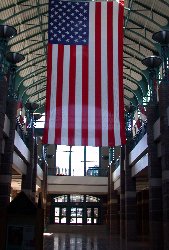 WOW! What will impress you enough will be the opening entree (Right) to the RiverCenter Glass, marble and rock are all you will see, and at night time, this place is even more impressive with all the lighting. But as if that's not enough, the lobby with it's massive hanging USA Flag (Left) to welcome this Great USA Championship event will set you in awe. The lobby alone is nearly the size of the entire venue for last year's event. Still no impressed? Then step into the main event room (Right) Last years venue of just over 8,000 square feet in size is dwarfed by the size of the 36,000 square feet RiverCenter facility. In the picture I took today at the right, Johnny Davis is dwarfed himself by the size of the room. 180 feet wide by 180 feet deep. You could fit over 4 of last years rooms inside this one easily. | ||