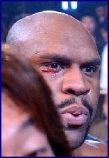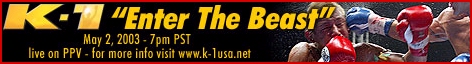 At 6' 7" tall and 374 lbs, very few thought he could be stopped but this last weekend, Bob Sapp, (Pictured at right & below) the big hype for K-1 was stopped BIG! At the K-1 show in Omiya at Saitama Super Arena, Mirko "Cro Cop" Filipovic (Left, 6'2, 227lbs) had little trouble in defeating Sapp in the 1st round in 1 minute, 26 seconds by KO from a straight left punch. Once Sapp hit the mat, he couldn't move and the 10-count was given for the KO win to Filipovic, as Mirko jumped up and down in the ring from excitement. Sapp was taken to the hospital in Saitama right after and it's confirmed that he did in fact suffer a broken eye socket. He bled under the crushed eye socket and in fact started tearing up. The Japanese media billed Mirko's win over Sapp as if a normal human being had defeated Godzilla. Excuses were made in the papers that Sapp had no time to train because he was spending 15 hours a day for publicity work. K-1 matchmaker Sadaharu Tanigawa said that he has all intentions of booking a re-match between Filipovic and Sapp. Sapp is out for at least six weeks after suffering a fractured right eye socket and a lacerated eyelid and is not expected to fight this coming May 2nd in Las Vegas, Nevada. Especially since the KO is well inside the International Rule of a 45 day KO/TKO suspension, something the K-1 organization is sure not to ignore. He has cancelled all future publicity events in Tokyo for the near future and was not at K-1's press conference on Monday. He made his first public appearance in Tokyo since getting KO'd (Right) wearing a pirate patch over his eye and said that he would be willing to confront Mirko in a PRIDE ring, saying "With that policeman guy, I'll fight him again and finish him." He said that Mirko got lucky with his straight left punch and that the punch was a one-in-10,000 shot of KOing him. For more on the story see the K-1 USA page by clicking HERE. That 45 day KO/TKO Suspension rule looks like it will cause even more damage at K-1 USA this coming May. As of 3-24-03 the tournament consisted of; Sapp, Michael McDonald, Rick Roufus, Dewey Cooper, Giuseppe DeNatale, Chad Bannon, Jefferson Silvia and Carter Williams. However, at the same event Sapp got KO'ed on, Ernesto Hoost KO'ed Silva (See Right) at 2:55 of round 1 so he's out of the line-up now too. Worse yet, the word on the street is that Chad Bannon (Venice, California, USA) will be fighting this weekend. Lets hope he doesn't meet the same fate as Sapp and Silva... Bannon has been an actor and stuntman on the show Battle Dome. Our question is, "Why would these fighters take such a risk fighting so close to another high profile event?" Oh well, looks like they will learn their lesson now... |