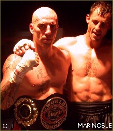 The IKF started sanctioning San Shou on March 20th, 1999 at the Vallejo Fair Grounds in Vallejo, California, USA. The event was promoted by IKF Promoter Tim Stell of Fairfield, California. In the first ever, official IKF San Shou Rules Bout, Shawn Salmons of San Jose, California, USA defeated Alan Kanig of New York, New York, USA by TKO in round 1. In the second IKF San Shou bout Marvin Perry of Boston, Massachusetts, USA defeated Adam Resnick of New York, New York, USA by HEAD Kick KO at :22 seconds of round 2. Next came the Pro San Shou division. The first Pro San Shou bout was an IKF title bout and featured Al Loriaux of Boston, Massachusetts vs Sean Douglas of Toledo, Ohio. In the bout, Douglas attempted a jumping leg scissor takedown and landed wrong on his arm and injuring it. Loriaux was ahead on points at the time of the injury and Douglas could not continue so at the time, Loriaux became the first ever, IKF San Shou Champion winning the IKF San Shou Rules, United States Super Welterweight Title. However, the bout was later ruled a "No Contest". This meant that the first ever IKF San Shou title was still up for grabs and history was still in the making. Enter already, two time National San Shou Champion Rudy Ott. At the time, Ott had a record of 18 wins and only 1 loss and was training out of Boston, Massachusetts. Ott stopped his opponent Cary Nathan of Redwood City, California, USA by KO at 1:45 of the 3rd round to be the first ever IKF San Shou champion winning the IKF Pro San Shou Rules US Super Middleweight Title. Ott didn't stop there. He later moved to San Jose California to train with now IKF San Shou World Champion Cung Le. On December 15th, 2001 in San Jose, California Ott went on to win the IKF Pro San Shou Intercontinental Title when he defeated Peter Kaljevic (Both shown at ABOVE right - After the bout with IKF Referee Dan Stell) who was born in Montenegro, Yugoslavia but lived in New York City, New York, USA. This fight was clearly the "Rudi Ott Show" as he used nearly every throw in the book scoring often as if Kaljevic never knew a counter. In the end Ott won a unanimous decision. On that same event in San Jose, the man who caught the eye of the IKF and sparked the beginning of IKF San Shou, Cung Le, (Left) became the *Second IKF Pro San Shou World champion when he defeated Shoni Carter of Chicago, Illinois, USA by unanimous decision winning every round. (*) "Second" because someone else had an IKF World San Shou title before Le. The Semi Main Event that night lost some of it's hype when IKF MT & IR World Champion Danny Steele of Los Angeles, CA, USA didn't make the weight cut off of 147 lbs. for the vacant IKF San Shou Welterweight World Title. Steele made 149.5 but was unable to drop any more. Because of this his scheduled opponent, Matee Jedeepitak of Ratchaburi, Thailand via Indianapolis, Indiana, USA was awarded the first ever IKF Pro San Shou World Title by forfeit. Still, these two fought anyway in what was "Suppose" to be a San Shou rules bout. However, neither showed they had any San Shou skill at all and the bout played out to be a MuayThai bout with a couple of ugly takedowns. Jedeepitak has never been challenged for the title and has never fought San Shou since. Both Ott and Le have been important parts of IKF San Shou as fighters, trainers and event promoters. They along with others such as Promoters David Ross out of New York and the Stell brothers out of Fairfield have kept IKF San Shou busy. Ott went on to win his own IKF San Shou World title when he won the IKF Pro San Shou Middleweight World title by defeating Dave Marinoble (Both shown at right) of Roseville, California, USA by unanimous decision on August 31st, 2002 at Win-River Casino in Redding, California. The bout was scored 48-47 by 2 judges while the 3rd saw it 49-46. On December 7th, 2003 the IKF spread it's San Shou wings when it sanctioned 3 IKF Pro World Titles in Beijing, China. That night the IKF crowned 3 new San Shou world Champions. Light Welterweight Champion Han Yuzhu Beijing of China when he defeated Fernando Calleros of El Paso, Texas USA by unanimous decision. Super Middleweight Champion Bao Ligao of Beijing, China defeated Dave Marinoble of Roseville, California, USA by unanimous decision and Light Cruiserweight Liu Hailong also of Beijing, China when he defeated Eduardo Fujihira of Brazil by unanimous decision. The last big IKF Pro San Shou World title was for the vacant Super Welterweight division. the bout was on May 1st, 2004 in Brunssum, Holland/Netherlands when Danny Hoyer of Holland defeated Alexis Hountondji of Belgium by KO when Hountondji could not stand by the end of Referee Dan Stell's count of 10 after a strong knee by Hoyer to his body at 1:00 of round 5. The event was promoted by Hoyer's father, Loe Hoyer (Both shown at right) and was the first IKF Sanctioned San Shou event fought on a "Traditional" San Shou fighting platform, not a boxing ring. As for the event itself, Loe Hoyer left noting out. From the impressive dual lion dance opening to the lights, cameras and action, this event had BY FAR the BEST San Shou fighting as a whole we had ever seen. All the fights were fought under San Shou rules and one thing is for sure about European San Shou... These guys ROCKED!
