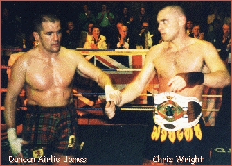 Across the ring from DeNatale will be the pride of Scotland, Duncan Airlie James. James' last fought for the IKF back in St. Helens, England on August 16th, 1998. There he faced Chris Wright of Merseyside, England for the vacant IKF Pro MTR Cruiserweight World Title. In the bout, James lost by a head kick KO at 2:04 of round 2 (At Right, after bout). Wright has not fought for some time and recent word is that he has retired from the ring. Unlike Wright, James has been VERY Busy in the ring and has no plans