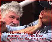 Norman Stone, the Manager of John Ruiz, fought with several people after Valuev won the WBA Heavyweight Title from Ruiz. He literally grabbed the belt away from Valuev after the fight and ran around the ring holding it over his head until five ring bodyguards forcibly took it back. German promoter Wilfried Sauerland accused him of inciting the crowd, leading to the booing. What makes this even worse is that Ruiz was handed the title in April after losing to James Toney, who was then stripped of the crown for testing positive for steroids. In other words, Stone was fighting for something his fighter NEVER EARNED! This isn't the first time Stone has lost his cool in the corner. For one example, back in November of 2004 November 16, 2004, Referee Randy Neumann ejected him from Ruiz's corner after a constant barrage of foul language directed towards him (Neumann). The ejection came in the eighth round. However, boxing won't have to worry about his tirades any more. Stone announced his retirement on at the end of December last year, five days after Ruiz's loss. "I'm done," Stone said. "I'm tired of boxing and last week's bad decision was the last straw. I'm going to relax with my family and spend a lot of time with my two little grandchildren. I'm sorry if my actions sometimes upset people, but I always had John's best interests at heart. It was a great ride." "And speaking of foul-mouthed, Toney looks like a professor of literature when compared to Ruiz's guttural, low-rent trainer/cornerman, Norman "Stoney" Stone. I didn't think anybody could actually do it, but Stoney actually out-foul-mouths two of boxing history's most polluted mouths, the late Al Braverman and the even-later Jimmy DiPiano." - Randy Gordon, thesweetscience.com And to think... The Boxing Writers Association of America named Stone co-Manager of the Year in 2002. A lot of the info in this article came from Kim Murphy, Times Staff Writer - www.latimes.com - MOSCOW |