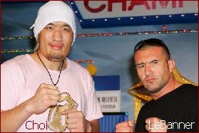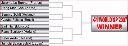 SEOUL, September 30, 2007: The K-1 World Grand Prix '07 Final Eight were determined at the Seoul Olympic Complex this past Saturday night, September 29th. The following day in the Grand Ballroom of the COEX Intercontinental hotel, the first-tier matchups were set for the December 8 Yokohama Arena GP Final. The pairings were decided with a system that combines choice and chance. One after the other, in an order decided by lot, the fighters were free to select any available position on the tournament tree. French K-1 veteran Jerome LeBanner got the first choice, and went to the "A" spot, red corner in the first bout. This is a fighters' favorite, as competing first affords the winner a longer rest period before the semifinals. Twenty-three year-old Japanese wunderkind Junichi Sawayashiki, who had drawn the number two selection, went against the "start early" strategy, opting to avoid LeBanner and instead put himself in the "H" spot, blue corner in the fourth quarterfinal. LeBanner was seen having a bit of a laugh at this. Next up was Korean fighter Hong-Man Choi, and the biggest guy in the tournament, (7'2, 355) who made a bit of a deke on the stage, suggesting he might line up beside Sawayashiki before walking over to the "B" spot and a date with LeBanner. This delighted the Frenchman, who exchanged high-fives with Choi. "I am very happy to fight this giant guy," said LeBanner, "December 8 will be a new Pearl Harbor!" Said Choi: "I am honored to be fighting someone I respect." Two-time WGP Champ Peter Aerts of the Netherlands was up next, taking the spot beside Sawayashiki to set up a fight between the tournament's oldest fighter (Aerts is 36) and the second-youngest (Sawayashiki is 23). |