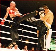 The popularity of the K-1 World Max 70kg/154lbs weight class rivals that of the World GP. Where the heavyweights have the power, the lighter fighters appeal with speed and stamina, consistently producing thrilling contests. This year's K-1 World Max eight finalists represented six different countries. The first quarterfinal was a keenly anticipated matchup between all-round kickboxer and media darling Masato of Japan, who won the Max Belt in 2003; and Thai fighter Buakaw Por Pramuk, whose positively lethal legs and fast fists made him the two-time and Defending Max Champion. Both fighters got the low kicks going early, and the first round had plenty of action -- Buakaw scoring with body blows and a high kick, Masato getting an uppercut in before surprising his opponent with an innocent-looking right straight punch to score a down. The second saw Buakaw good with the hard low kicks, Masato leading with the left straight and deftly picking his spots on the counters, connecting with another uppercut. Masato used the ring to effect, moving to his left, forcing Buakaw to approach with less than perfect positioning. In the third Buakaw needed a down to get back into the fight, but was uncharacteristically tentative with his attacks. Masato meanwhile continued his mastery, focused and fast with the straight punches, closing for another uppercut while absorbing his opponent's low kicks. A fine performance from Masato for the well-earned unanimous decision. The second matchup featured power puncher Mike Zambidis of Greece, a compact bundle of strength and determination; and Ukrainian Artur Kyshenko, a muay thai fighter who also likes the fists. A slow first, Kyshenko with occasional high kicks, Zambidis blocking well and countering with low kicks and body blows -- neither fighter connecting decisively, a slight edge to Kyshenko evidenced on two judges' cards. Better action in the second, Zambidis darting inside with punches but Kyshenko employing his 5cm/2" height advantage to arrest the Greek with long low kicks. In the third, Kyshenko went with the fists, pumping in body blows, while Zambidis launched a couple of flying knees that came up short. Spirited action to end the fight, which one judge gave to Kyshenko and two saw as a draw, triggering a tiebreaker round. A more aggressive Kyshenko in the deciding extra round, in with proficient kicks and combinations; Zambidis meanwhile circling with a hit-and-run strategy, missing again with his flying knees but getting body blows through. A difficult one to call, the decision going to Kyshenko. Dutch boxer Albert Kraus' speed, smarts and punches won him the inaugural World Max Championship in 2002. In tonight's third tournament quarterfinal, the 27 year-old Max veteran met the two-time and Defending Japan Max Champ, kickboxer Yoshihiro Sato. Sato started fast, intent on using his reach and 10cm/4" height `advantage to run Kraus down. But the Dutch fighter was equally aggressive, moving past the straight punches and knees with body blows and uppercuts. Sato sent a number of high kicks up throughout this one, but Kraus' evasions and blocking were sound. In second, a Sato knee looked to have Kraus in trouble, but the Dutch fighter answered with a dandy straight punch and left hook to regain his momentum. The third was thrilling, both fighters repeatedly clashing. Sato again used his long legs to fire the low kicks, and leaped forward with the knees. But a determined Kraus was smart in all aspects of his game -- his movement and positioning were perfect, and he tallied big time late in the round with a punch combination that snapped Sato's head back and, were it not for the ropes, might have put him down. One of the best fights on the night, the unanimous decision going to Kraus. Andy Souwer of Holland set off on the road to glory against muay thai stylist Drago, an Armenian known for both aggression and creativity. |