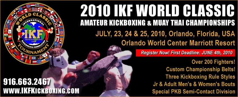 This past weekend in Orlando, Florida, the IKF World Classic Kickboxing Championship was the biggest ever in its 12 year history. Fighters literally came from around the world to compete in the Full Contact and the Semi Contact tournament. There were lots of thrills of victory and yes, especially this year, some agony of defeat (more in later articles). However, I think most there would agree that this was the best year ever with stiff competition and a ton of fight fans to cheer the fighters on. Again this year, the semi contact division of IKF Point Muay Thai Kickboxing was a major hit! The IKF PKB as it is called, was scheduled to start on Saturday night at 6:PM. However, due to some delays, the event didn't start until after 7:PM. All those waiting for the event were not disappointed as the action was HOT! Next year, we are working on measures to assure the start of the tournament will be as advertised as we continue to improve the event.