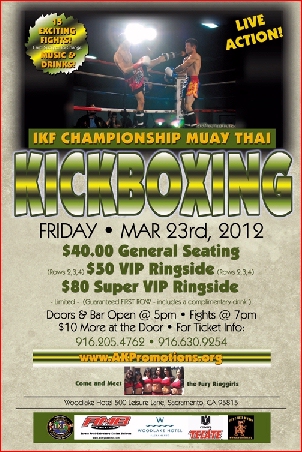 Friday, March 23rd, 2012, The Woodlake Hotel of Sacramento, CA (Formerly The Radisson Hotel) located at 500 Leisure Lane will be the location for another exciting edition of IKF Muay Thai Kickboxing. The popular show that features up to 17 bouts of full contact kickboxing action between men and women, will return to Sacramento laced with a Las Vegas appeal to the delight of the thousands of fight fans! Local promotions company AK Promotions based out of Rocklin, CA will be producing this exciting event. AK Promotions is one of the most aggressive promotions company in the area for putting on such events and have been noted as one of the best promotions companies for Kickboxing in the country. The shows are loaded with action, theatrical lighting, beautiful ring girls, adult beverages and lots of great food combined with blasting music and videos to set the stage for a great evening out on the town. IKF Muay Thai Kickboxing events have been packing ballrooms in the Sacramento area for the past four years but still remains under the radar to major media. However, it continues to grow in leaps in bounds as AK Promotions events are expanding across the State. On May 5th in celebration of Cinco De Mayo AK Promotions will promote their second event at the newly renovated Oakland Convention Center, located in Oakland CA with fighters coming as far as the Netherlands! Official weigh-ins for the Sacramento show will take place at the Woodlake Hotel starting at 8:AM on Friday morning March 23rd. Doors and Happy Hour bars will open in the ballroom at 5:PM and fights will start at 7:PM. Parking is available at the hotel for a nominal fee. Tickets range from $40 to $80.