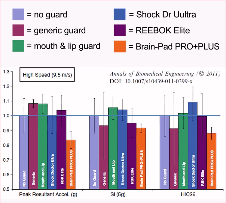 Funded Below is the NFL funded mouth guard testing and analysis on the major (Mouth Guard) brands in the industry. As you will see as far as impact forces being transferred to the head, the upper mouth guards actually accelerated impact forces compared to wearing no mouth guard at all. Only the Brain-Pad Jaw-Joint Protector reduced impact forces being transferred to the head. This testing assures individuals who wear the Brain-Pad Jaw-Joint Protector are protected by the finest protection currently on the market.