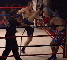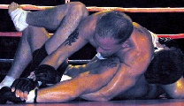 ROUND 3 ROUND 4 Dixon's belt was presented by special guest Frank Shamrock (Right). The win gave "BIG John" the IKF Pro Super Heavyweight MuayThai Title and brought some attention for him as being a potential contender for the K-1 North American Tournament. Question is, is there an opening for him? Well, there just so happens to be one we know of... From what we found out last Thursday, a day before this bout, Collyer had pulled out of the K-1 North America Qualifier event in Milwaukee Wisconsin in February of 2002. If there's still an opening where Collyer's name once was, we'd like to suggest Dixon be the one to fill it. Under the circumstances, it would only seem fair. As far as Collyer, he already had plans to stay in the Heavyweight Division (Under 215 lbs.) which is where we feel he's the strongest. Once again, nearly every title in the heavyweight division is vacant and Collyer's proved he's a contender in any of the rules styles at that weight. We're sure to see Collyer back again in the heavyweight division after his foot heels and if Dixon can't get his shot in the K-1 North American Tournament, there's always the chance of him going to England to face Matt Skelton in March for Skelton's IKF MTR World Title. Here's a review of all the nights bouts.