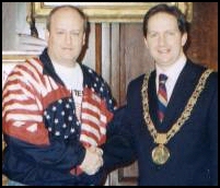 Non IKF Event - November 2001, Dublin Ireland: Head Coaches, Rob (Photo at Right - Pictured Far Right) & Jim Zbilski (Pictured far Left) of Team Z Kickboxing, once again, brought a team of fighters representing the USA to Dublin, Ireland for an evening of International competition. Representing the team from the USA were none other than IKF US Champions Joe Taylor, Kyle McElroy, and Peyton Russell, IKF US finalist Renee Broadacz as well as Tim Mazurkiewicz, Rick Bloyer, Jim Klauba and John Ohnona. The team from Ireland consisted of fighters from Gallway, Dublin, Waterford and Belfast. The event was hosted by Joe Canning. In attendance were several key members of the Irish government, including the Lord Mayor of Dublin, Michael Mulcahy, (At Left with Coach Rob). Only 6 of the team of 8 competed in Team Competition (USA Vs Ireland). Of the 6 bouts, the outcome of the evening was a draw with 3 victories to Team USA and 3 to Team Ireland. For the second year in a row, this friendly competition has grown to such a success that plans are already in the works for 2 more share events for 2002. Plans include Team Z's traveling to Gallway in May, 2002 and the Irish Team to come to Chicago in November. |