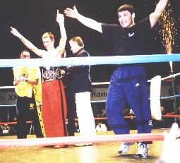 Last Saturday night, February 3rd, the IKF made it's debut in Omsk, Siberia Russia as Promoter Oleg Vadaturskiy brought together Englands Perry Ben and Russia's Vladimur Autamonov (Both Pictured Left in photo) to fight for the vacant IKF FCR Super Welterweight World title. Over 4,000 people watched Autamonov & Ben fight a full 12 rounds that was one of the most exciting World Title bouts ever with tremendous action from both fighters in each and every round. It wasn't the first IKF event in Russia and it surly won't be the last. The person who brought everyone together for the event and several meetings in regards to the growth of IKF in Europe was IKF Russian Representative Oleg Vadaturskiy. (Far right in photo) Vadaturskiy became a big part of the IKF last year after leaving another England based sanctioning body that many other representatives, fighters, trainers and promoters have left to join the IKF for many different reasons. While in Russia, IKF President Steve Fossum (In group photo on left) and IKF European Director Alby Bimpson (In group photo 2nd from right) agreed to combine forces with a large Russian National League of Kickboxing to form the IKF Russian National League of Kickboxing. Working together, the two organizations will help build up kickboxing in Russia and provide exposure for Russian fighters for bouts around the World. The IKF plans to do this for many more countries throughout Europe in 2001 as well as part of their 2001 Game Plan. IKF Promoter and Russian Representative Oleg Vadaturskiy (Below at right in photo) celebrates his fighter Vladimir Avtamonov (Red pants kicking Ben at right and below as awarded World Title Belt from IKF President Steve Fossum) unanimous decision World title victory after 12 Rounds against England's Perry Ben for the vacant FCR Super Welterweight WORLD Title. In a 12 round bout, the minimum required amount of kicks would be 12 x 8 = 96. However, Avtamonov threw over 160 kicks over 12 rounds while Ben threw over 120. There wasn't a round that these two fighters weren't going toe to toe. This was one of the most exciting World Title bouts ever by 2 GREAT FIGHTERS! The night also featured 2 IKF FCR Russian National Pro titles which were co sanctioned with the Russian National League. |
