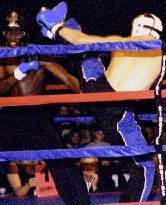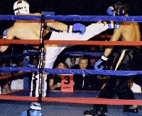 Fight 12 was the fight the majority of the crowd was waiting for. It was time for the "Wonderboy", Stephen Thompson (Left, trained by his father, Ray Thompson and 2001 IKF National Amateur Champion) to do his thing and that was to knock someone out. His opponent was Nicholas Donahue from Augusta, Georgia. Of course Donahue had different thoughts on the subject. The fight started off WIDE OPEN from the bell with Donahue jumping on the "Wonderboy" and putting him on the defensive. After a few exchanges Thompson found his groove and started to work it. With round one in the bag Thompson came out in round two smoking and at about 20 seconds in the round Thompson dropped an axe kick (See Right) on Donahue's head followed up by a straight right that sent the larger Donahue into never, never land. Thompson wins by ko at 20 seconds of the second round. Man what a show and that Wonderboy knows how to put one on!!! RESULTS OF THE OTHER BOUTS